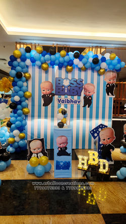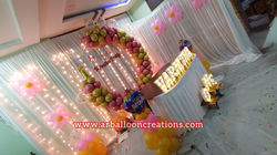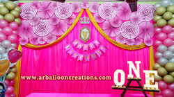 We are finest Balloon decorators, but along with the balloons we also do all kinds of Themed decors including 2D/3D setups made of Flex / Foam / Thermocol, Paper arts (Paper flowers, Paper fans & pompoms). We also provide other services like Lighting & Cloth decors also.